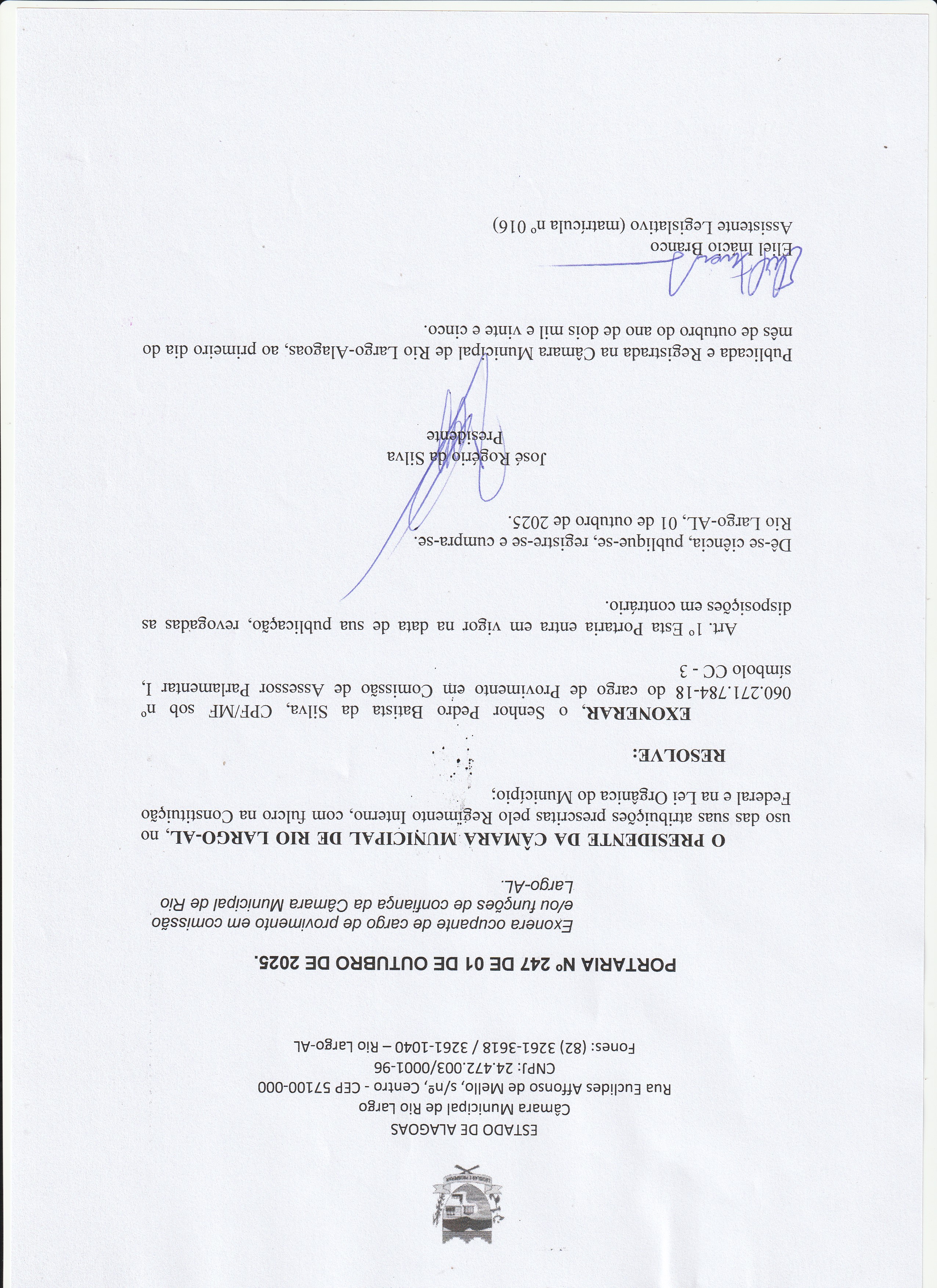 EXONERAR, o Sr. Pedro Batista da Silva, do cargo de Provimento em Comissão de Assessor Parlamentar I, símbolo CC-3